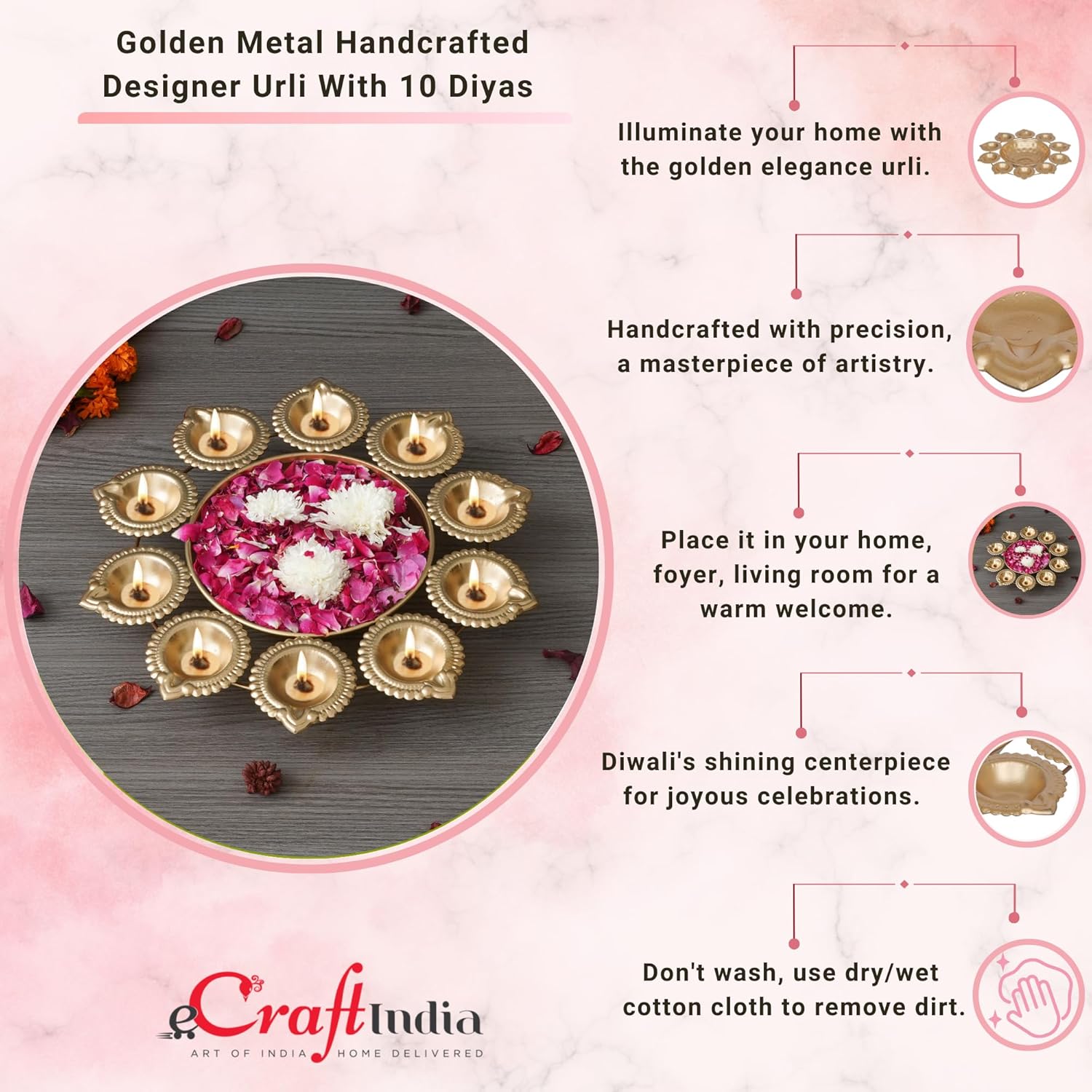 - An ideal gift for Diwali, weddings, or housewarmings. This Urli Bowls symbolizes illumination and tranquility, making it a thoughtful diwali decoration items for home decor that celebrate light, harmony, and new beginnings.
